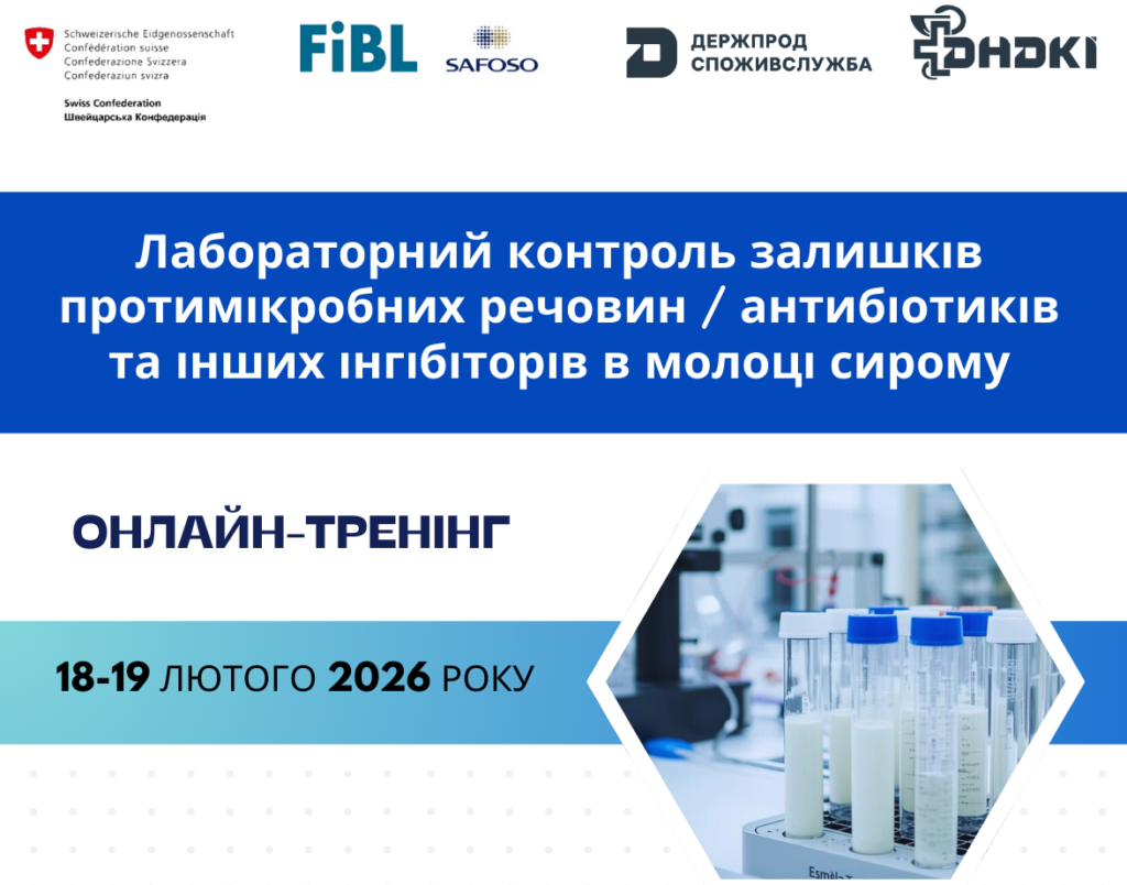 За підтримки Швейцарії у межах швейцарсько-української програми «Розвиток торгівлі з вищою доданою вартістю в органічному та молочному секторах України» (QFTP), що впроваджується Дослідним інститутом органічного сільського господарства (FiBL), Швейцарія) у партнерстві із SAFOSO AG (Швейцарія), 18-19 лютого 2026 року Державний науково-дослідний контрольний інститут ветеринарних препаратів та кормових добавок проведе онлайн-тренінг «Лабораторний контроль залишків протимікробних речовин / антибіотиків та інших інгібіторів в молоці сирому».
