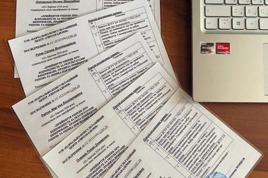 Під час навчання учасники опрацювали вимоги ДСТУ EN ISO/IEC 17025:2019 щодо формування заяв про відповідність, а також ознайомилися з ризиками, що супроводжують процес прийняття рішень, правилами прийняття рішень та методикою оцінювання ризиків залежно від обраного підходу.