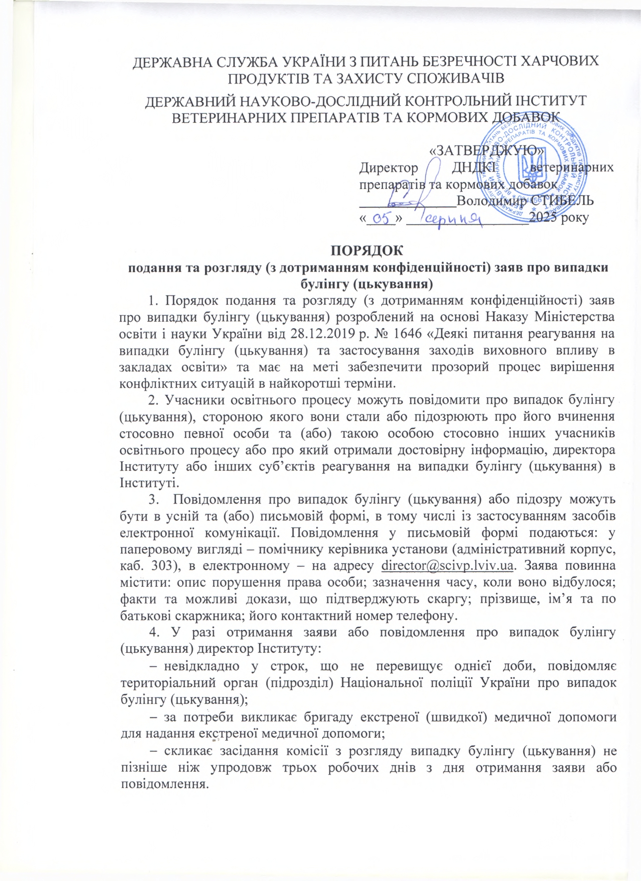 Положення про Центр професійного розвитку та підготовки фахівців Державного науково-дослідного контрольного інституту ветеринарних препаратів та кормових добавок →Правила поведінки слухачів (здобувачів освіти) у Державному науково-дослідному контрольному інституті ветеринарних препаратів та кормових добавок →Правила прийому слухачів до Центру професійного розвитку та підготовки фахівців Державного науково-дослідного контрольного інституту ветеринарних препаратів та кормових добавок →План заходів, спрямованих на запобігання та протидію булінгу (цькуванню) →Порядок подання та розгляду заяв про випадки булінгу (цькування) →Порядок реагування на доведені випадки булінгу (цькування) та відповідальність осіб, причетних до булінгу (цькування) →