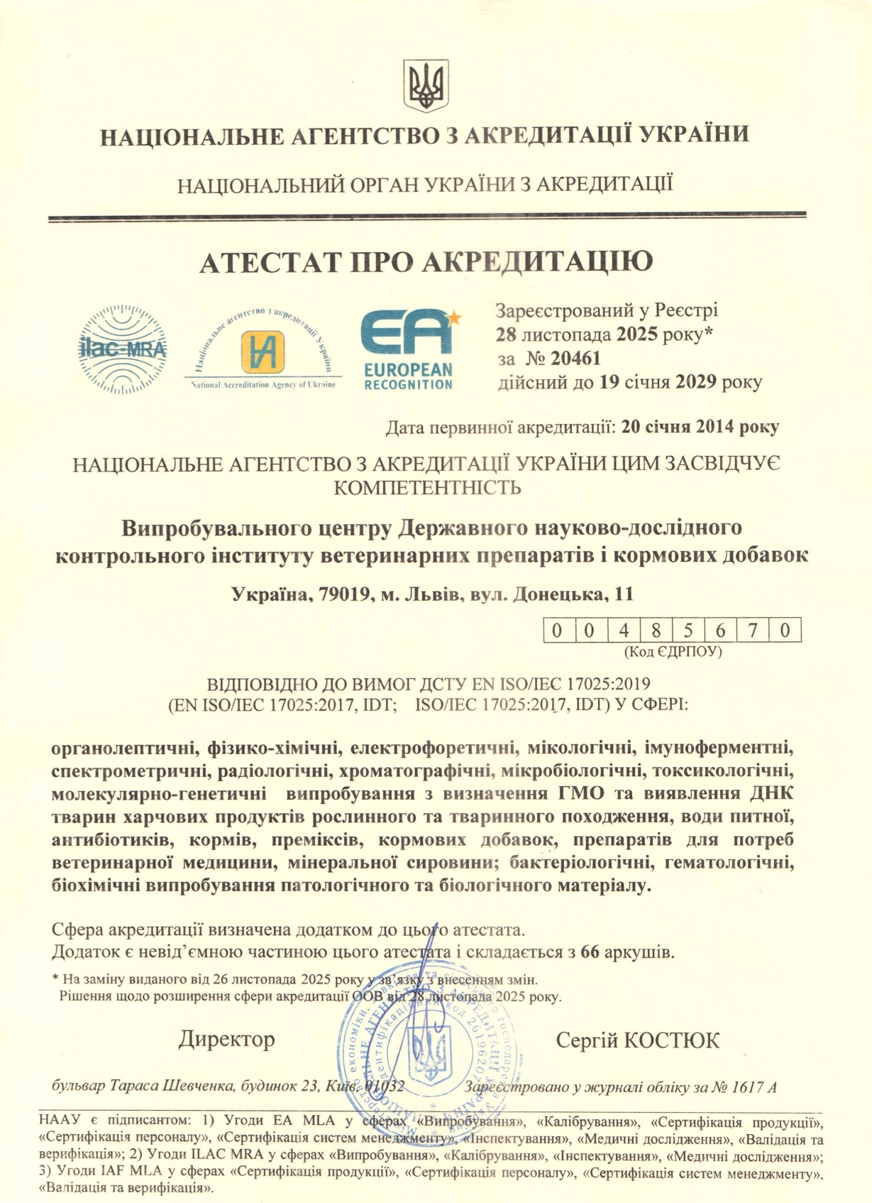 Є провідною координуючою науково-контрольною установою України з проведення наукової експертизи реєстраційних досьє з метою державної реєстрації (перереєстрації) ветеринарних препаратів та кормових добавок, а також здійснення науково-дослідних робіт із розробки нормативно-технічних документів, методів контролю та державного нагляду за якістю і безпечністю продукції, яка використовується у ветеринарній медицині та тваринництві.